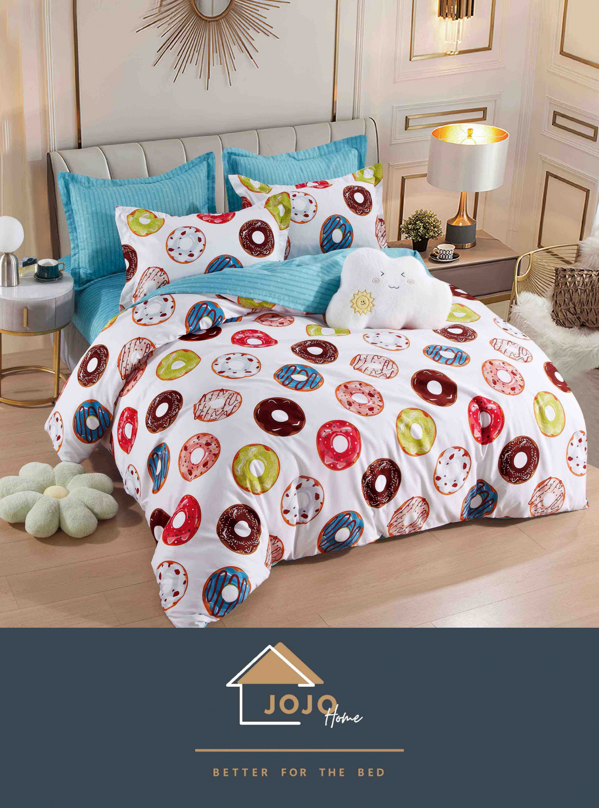 Lenjerie Jojo Home, 6 piese din bumbac finet cu imprimeu de gogoși colorate. Culoare, confort și bună dispoziție pentru întreaga familie.