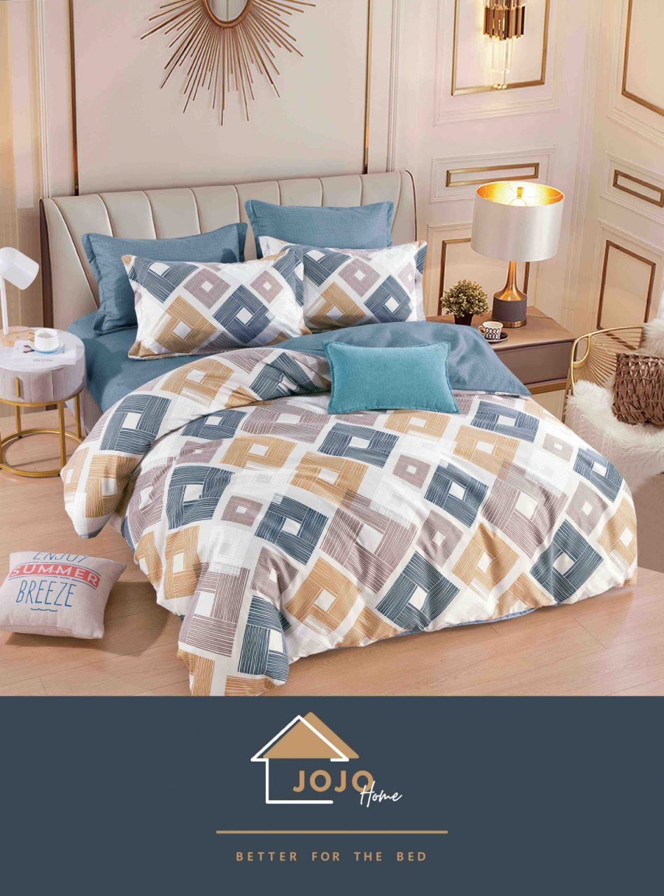 Jojo Home Lenjerie de pat dublu, 6 piese, bumbac finet, imprimeu geometric albastru-muștar – Jojo Home