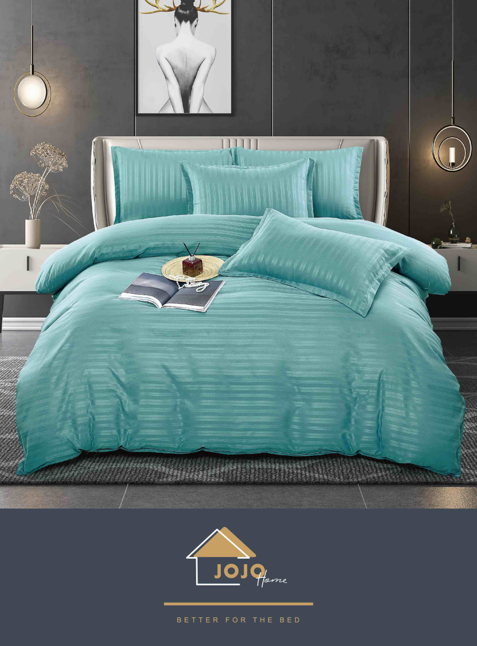 Lenjerie premium JoJo Home din bumbac damasc turcoaz – 6 piese, pat 2 persoane, cu cearceaf cu elastic, pilotă cu fermoar și fețe de pernă în două dimensiuni. Material fin, satinat, cu dungi elegante.